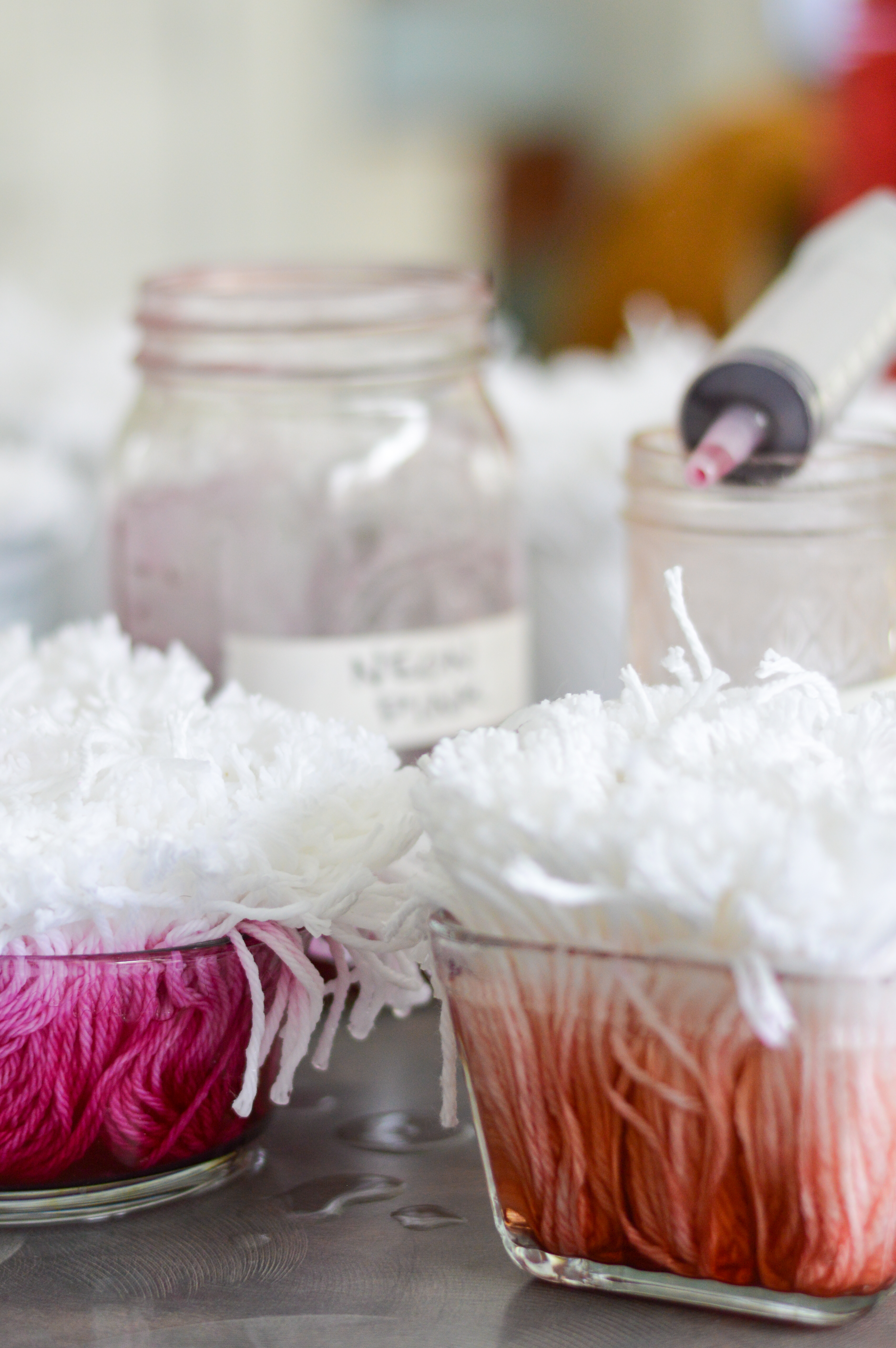 9. Watch the dye level closely as the yarn absorbs the dye… I added dye right to the top of the dyeing container so that the half inch or so of yarn that was above the rim of the container stayed mostly white.