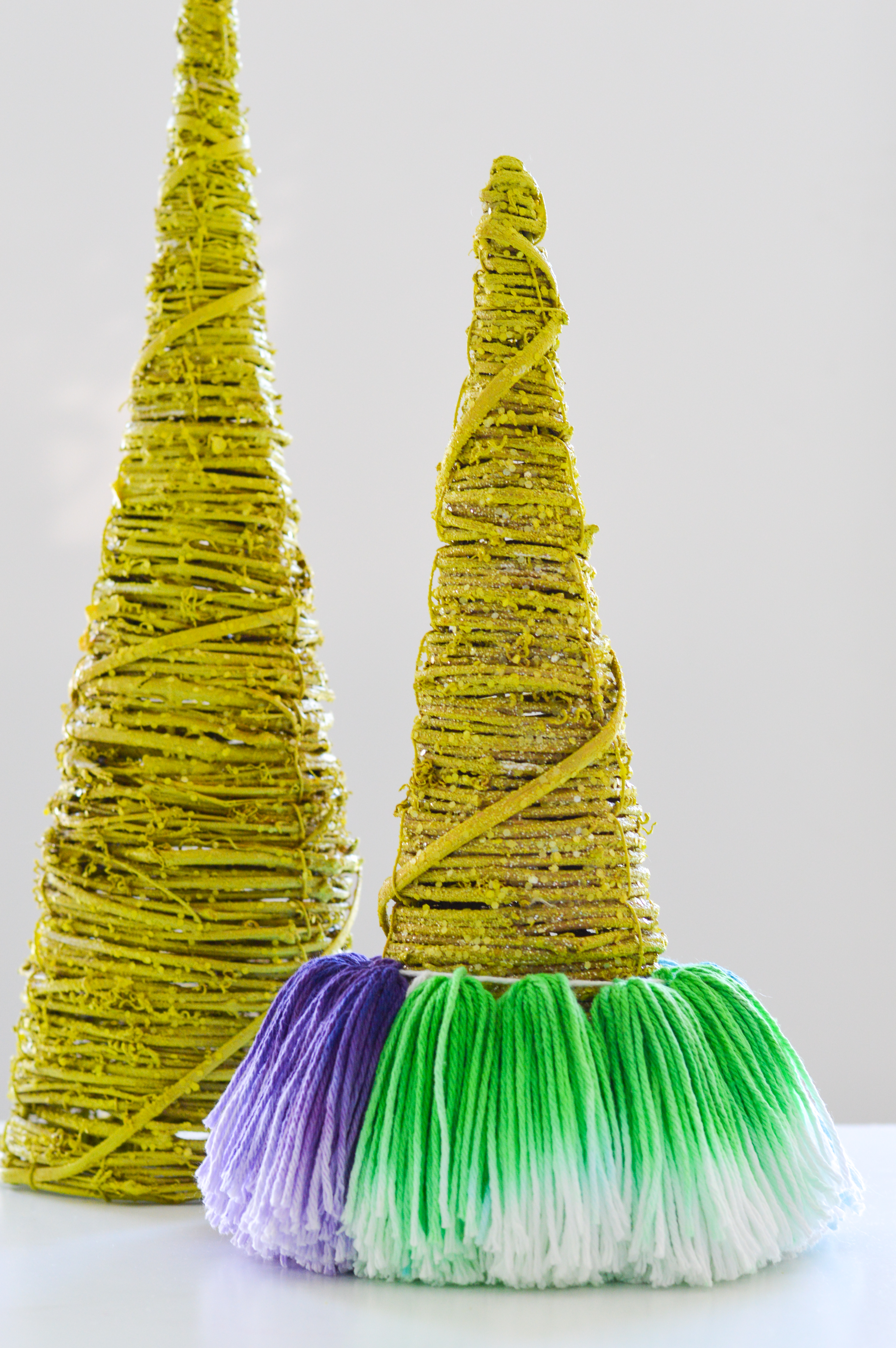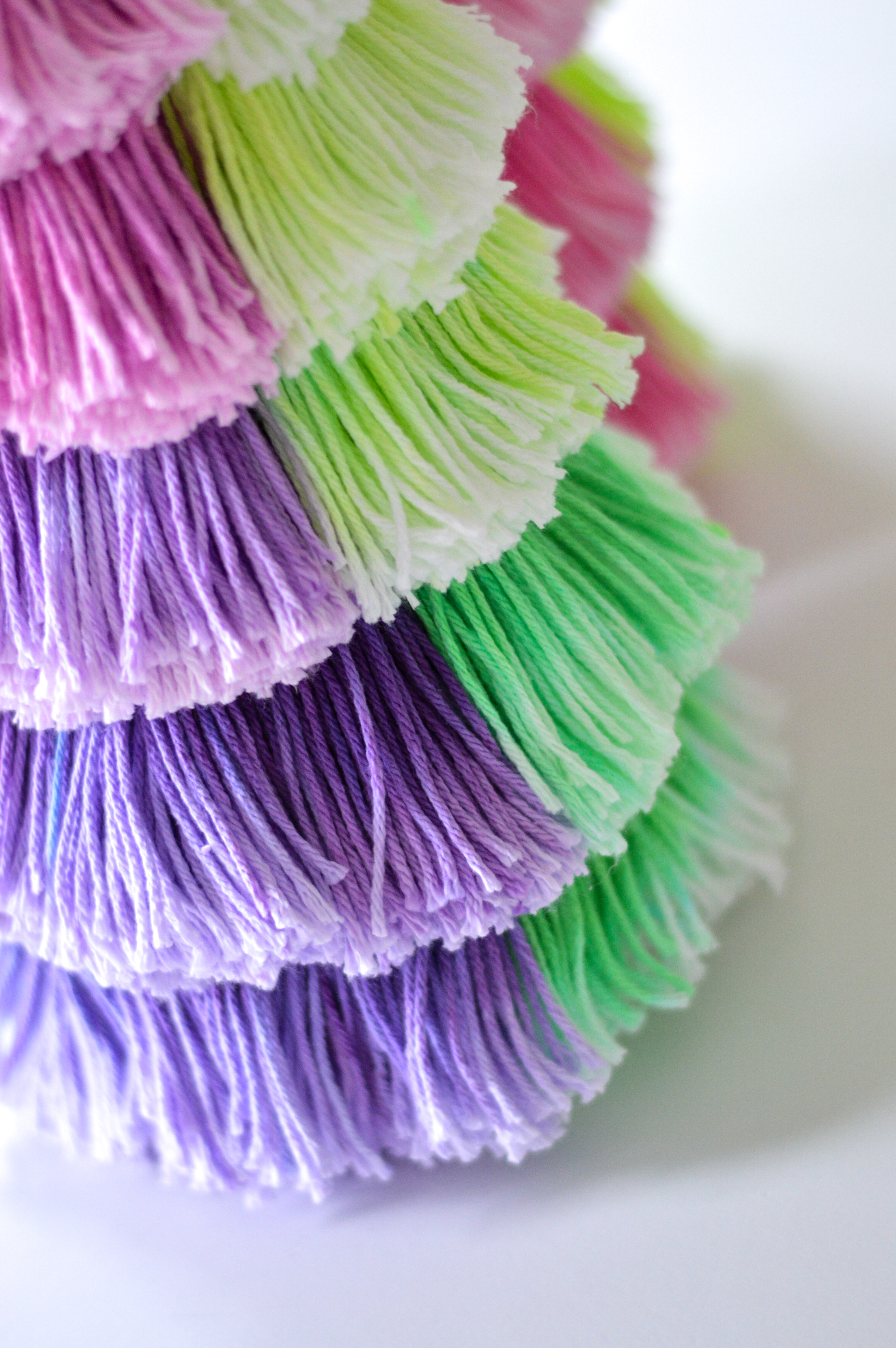 1. If you are making the tassel tree as shown in the photos, dye 12 Neon Green tassels, 10 Poolside tassels, 11 Neon Purple tassels, 6 Shocked Yellow tassels, 5 Island Aqua tassels, and 6 Pastel Lavender tassels.